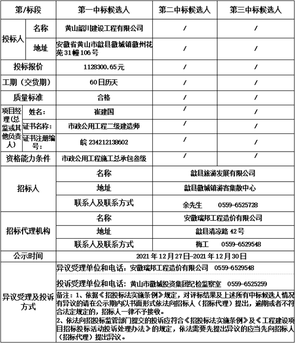 安徽瑞邦工程造價有限公司受歙縣旅游發(fā)展有限公司的委托,對歙縣雄村景區(qū)碼頭提升項目(AHRBGC2021S12003)進(jìn)行發(fā)包,本項目于2021年12月27日9時00分在安徽瑞邦工程造價有限公司開標(biāo)、評標(biāo),現(xiàn)根據(jù)有關(guān)法律、法規(guī)要求,對中標(biāo)候選人進(jìn)行公示。