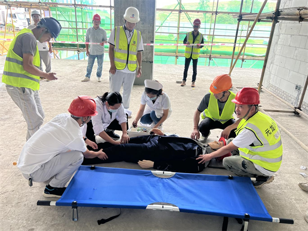 演練模擬富豐新城商務(wù)中心項(xiàng)目?jī)?nèi)粉刷施工現(xiàn)場(chǎng),施工人員在腳手架上進(jìn)行施工作業(yè)時(shí)不慎墜落,業(yè)主、施工單位立即啟動(dòng)應(yīng)急預(yù)案救援,迅速開展救援工作。演練中,搶險(xiǎn)救援、警戒疏散、后勤保障等演練組嚴(yán)格按照應(yīng)急預(yù)案通力協(xié)作、密切配合,圓滿完成了演練活動(dòng)。